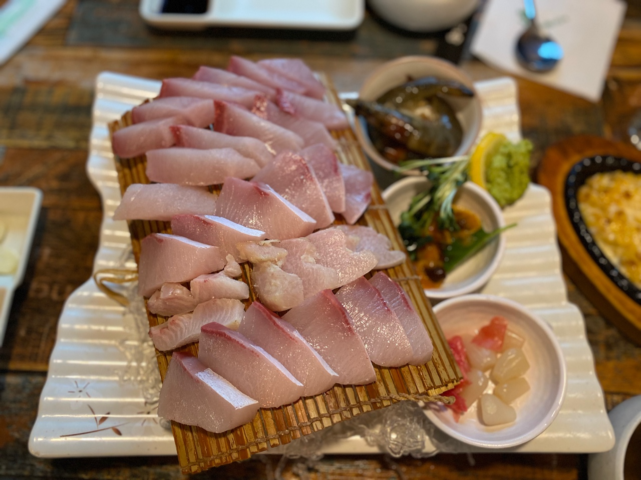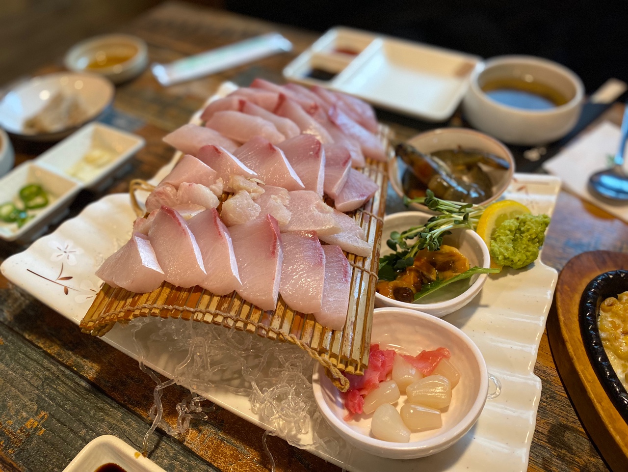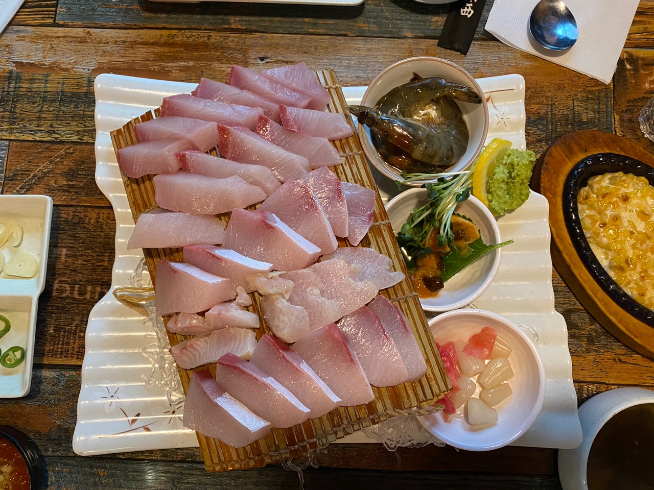 상차림은 정말 깔끔했습니다. 방어회가 테이블에 오르는 순간, 그 신선함과 맛에 감탄이 절로 나왔어요. 방어는 두툼하게 썰려 나왔고, 식감은 쫄깃쫄깃! 각종 반찬들도 신선하고 맛있었습니다.