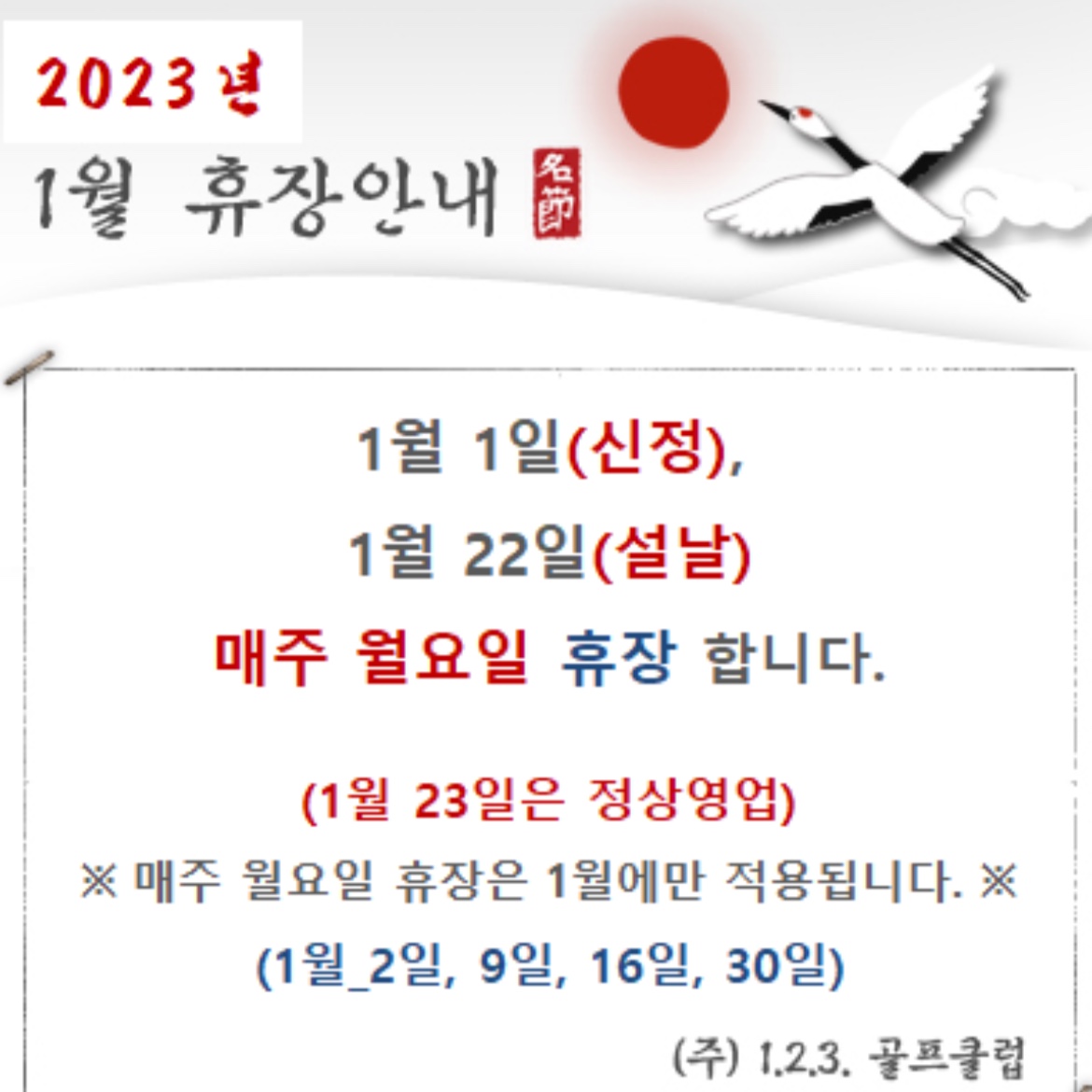 123골프클럽 설 휴무는 이렇네요.