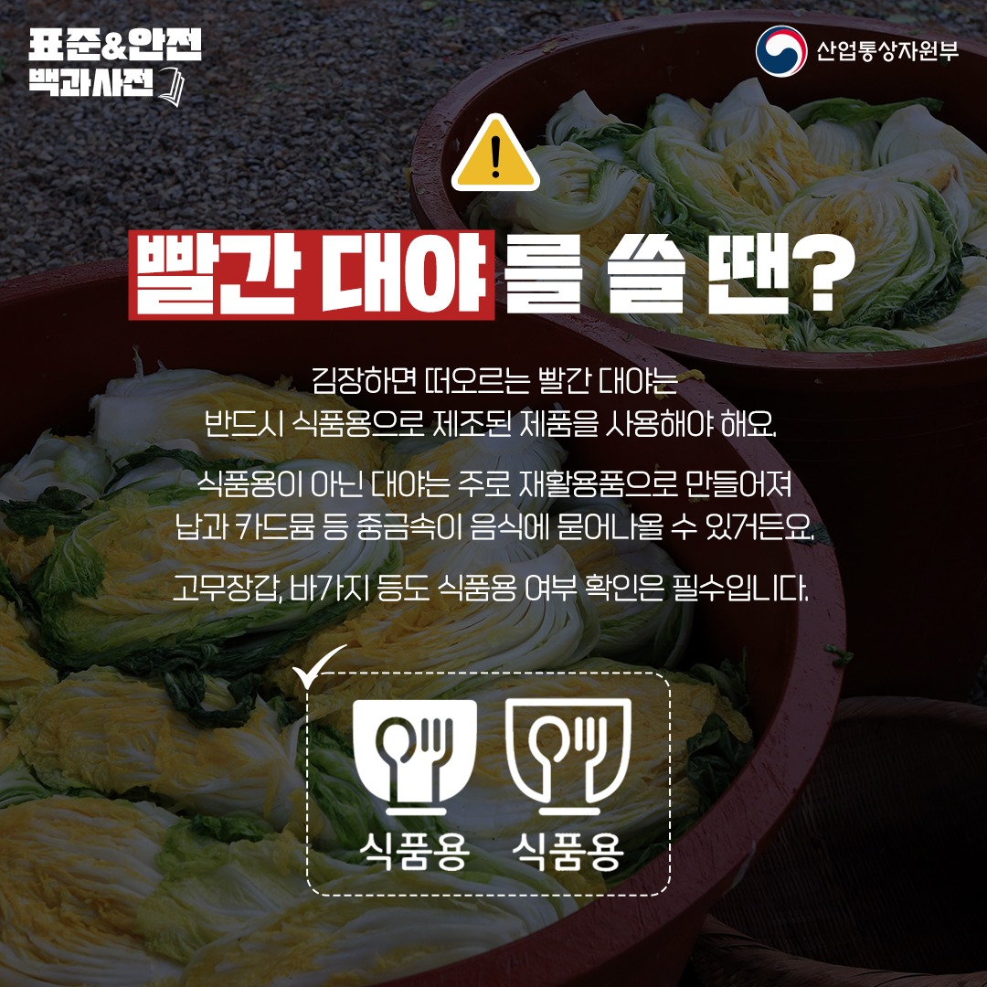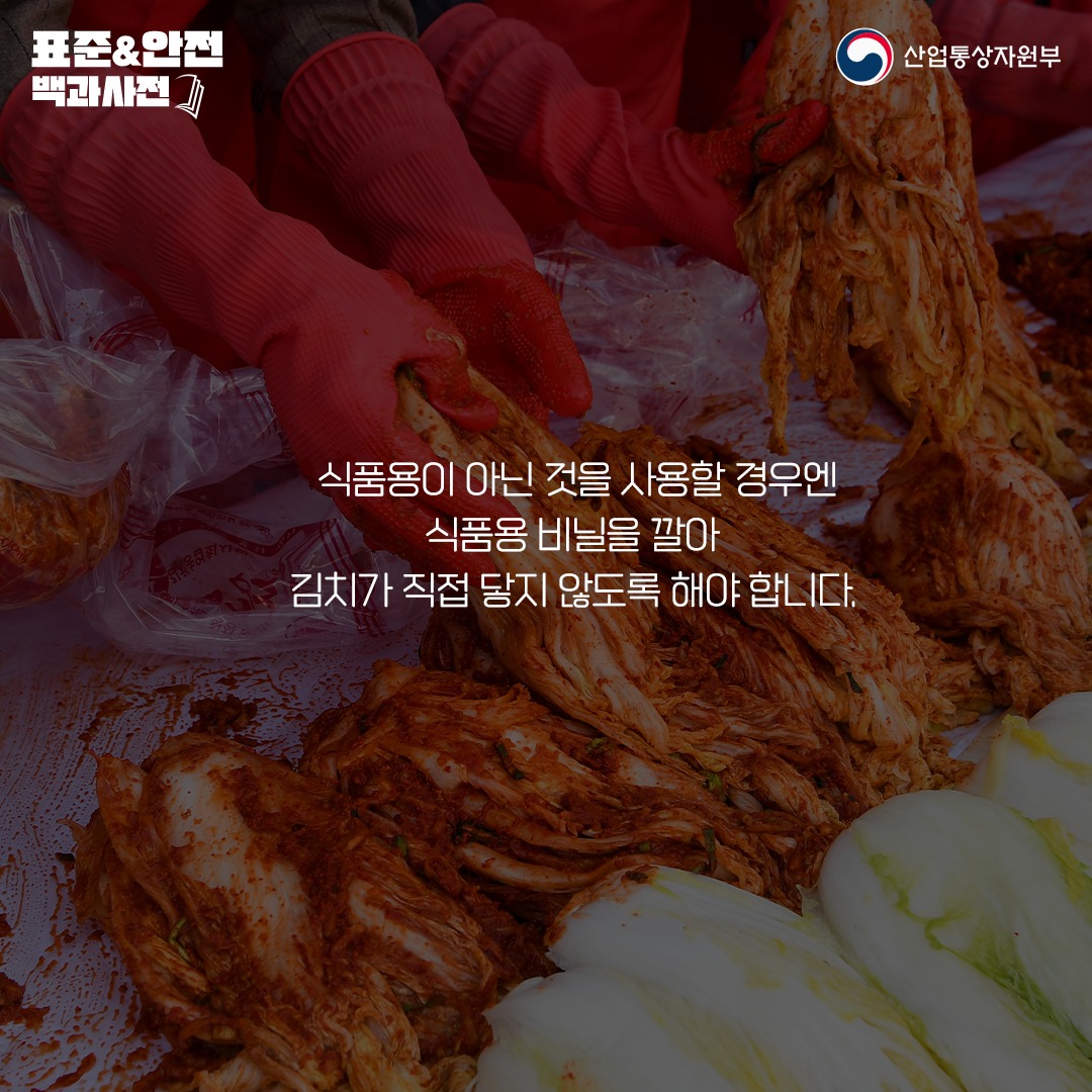 식품용으로 제조된 대야와 고무장갑, 바가지 등을 사용해야 하며, 식품용이 아닌 경우에는 식품용 비닐을 깔아 김치가 직접 닿지 않도록 해야 합니다.