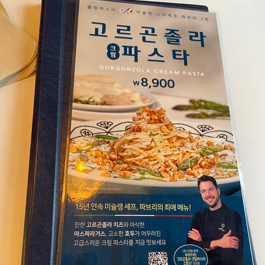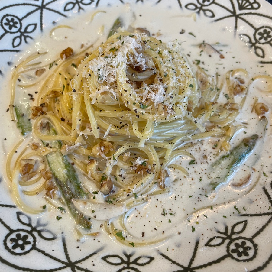 새로 나온 고르곤졸라 크림 파스타 : 이 파스타는 완전 제 취향이었어요! 구운 아스파라거스와 구운 호두 그리고 고르곤졸라 치즈맛! 이 조화 정말 잘 맞아요:)